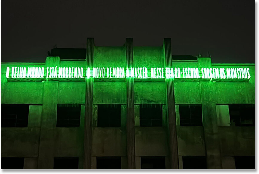 Alfredo é “gramsciniano”. Essa obra de luzes de neon revela uma frase escrita pelo filósofo italiano Antonio Gramsci (1891-1937) nos anos 30, na época do surgimento do fascismo. Este membro fundador do Partido Comunista Italiano, em particular, desenvolveu uma teoria da “hegemonia cultural” que parte da premissa de que a conquista do poder pressupõe a da opinião pública. Uma classe dominante impõe-se primeiro através de práticas cotidianas e crenças coletivas, aquelas engrenagens culturais que desempenham um papel fundamental no estabelecimento de um sistema de dominação. Alfredo retoma esses postulados para falar conosco sobre a luta política em torno da questão do desprezo social e das crises de liderança.