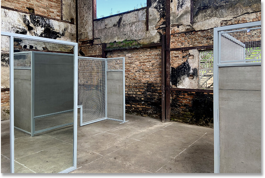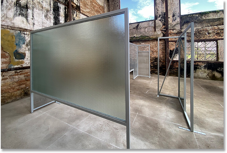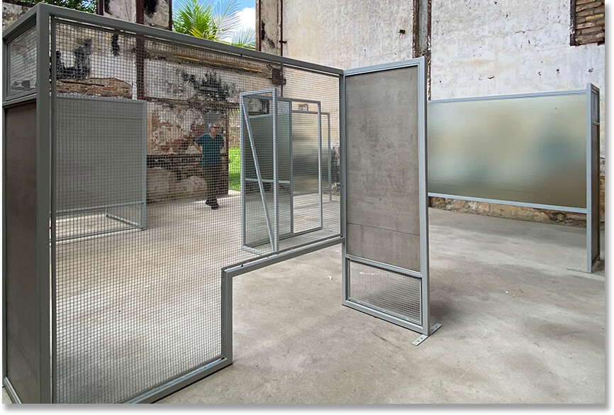 5 módulos formados por grade de aço, espelho, ferro, vidro aramado, vidro canelado, placa cimentícia, plástico