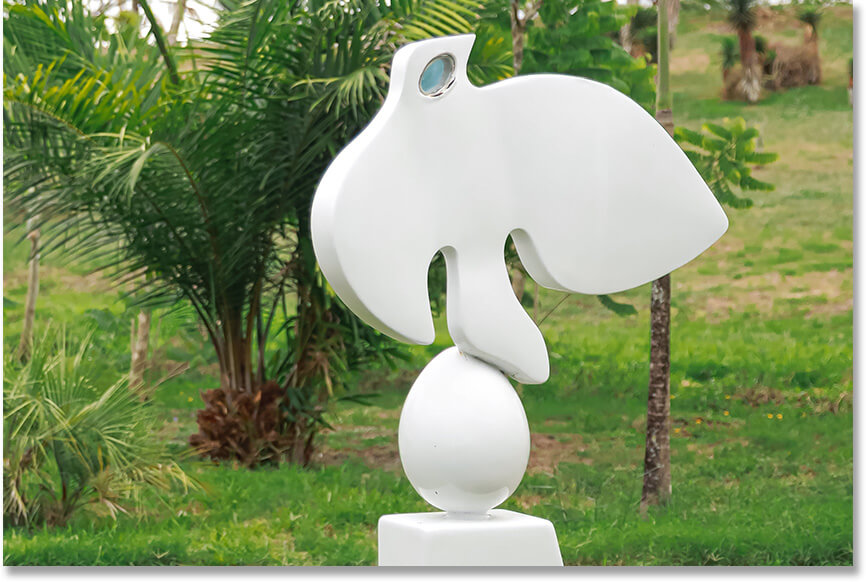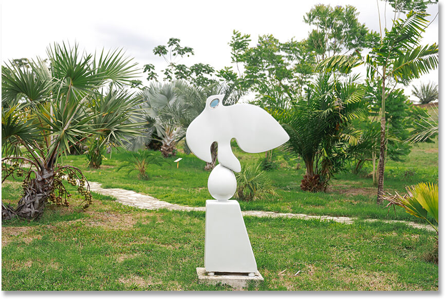 Inserida na paisagem do jardim botânico, a obra estabelece um diálogo harmonioso com a natureza, sugerindo voo, liberdade e contemplação. A pureza das formas e a suavidade dos materiais contrastam com a solidez do suporte, criando uma presença leve e poética no espaço.