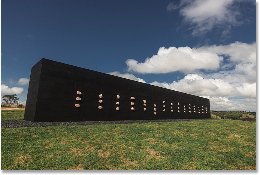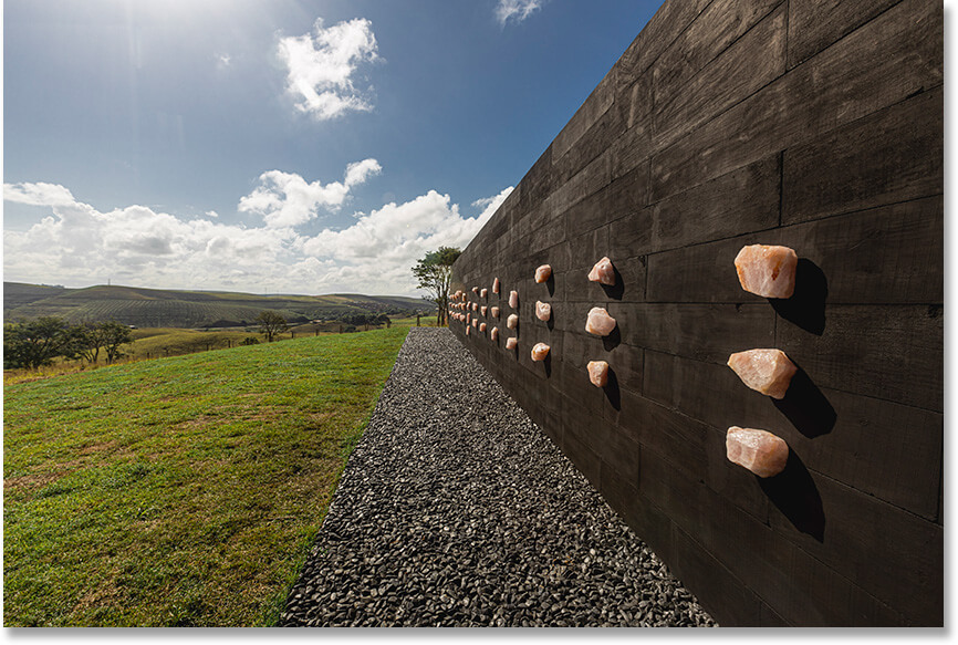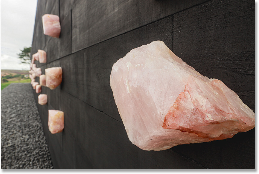 Muro com 25 metros de comprimento, 3 de altura e 2,5m de largura, no qual estão aplicados 12 conjuntos com três almofadas de quartzo rosa (vindos de Minas Gerais).