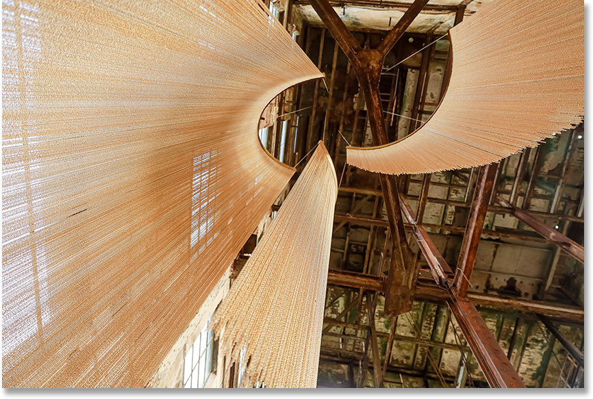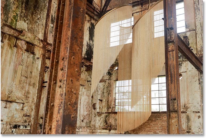 A escolha do dourado da obra não é arbitrária. Em suas pesquisas sobre a relação entre espaço, tempo e luz durante a Idade Média, Rizza observou que os artistas frequentemente utilizavam essa cor para representar o divino e o incompreensível. Em seguida vem a criação da forma e foi neste trabalho que deu início a utilização da curva, como elemento compositivo. Entre espaços mais densos e vazios, feixes sobrepostos e ângulos mais inclinados, foi construindo uma imagem que aos poucos consegui aprimorar. Dessa forma, imaginou três aros metálicos arqueados, cada um com um raio distinto, que se entrelaçam em um movimento espiralado. A escolha do material em alumínio, extremamente leve, proporcionou uma suavidade significativa à instalação. Ela se movimenta sutilmente, interagindo não só visualmente com o espaço, mas fisicamente.