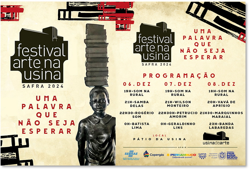 O Festival Arte na Usina — Safra 2025, promovido pela Usina de Arte, chega à sua 11ª edição e acontece de 5 a 7 de dezembro, em Água Preta, na Mata Sul de Pernambuco.